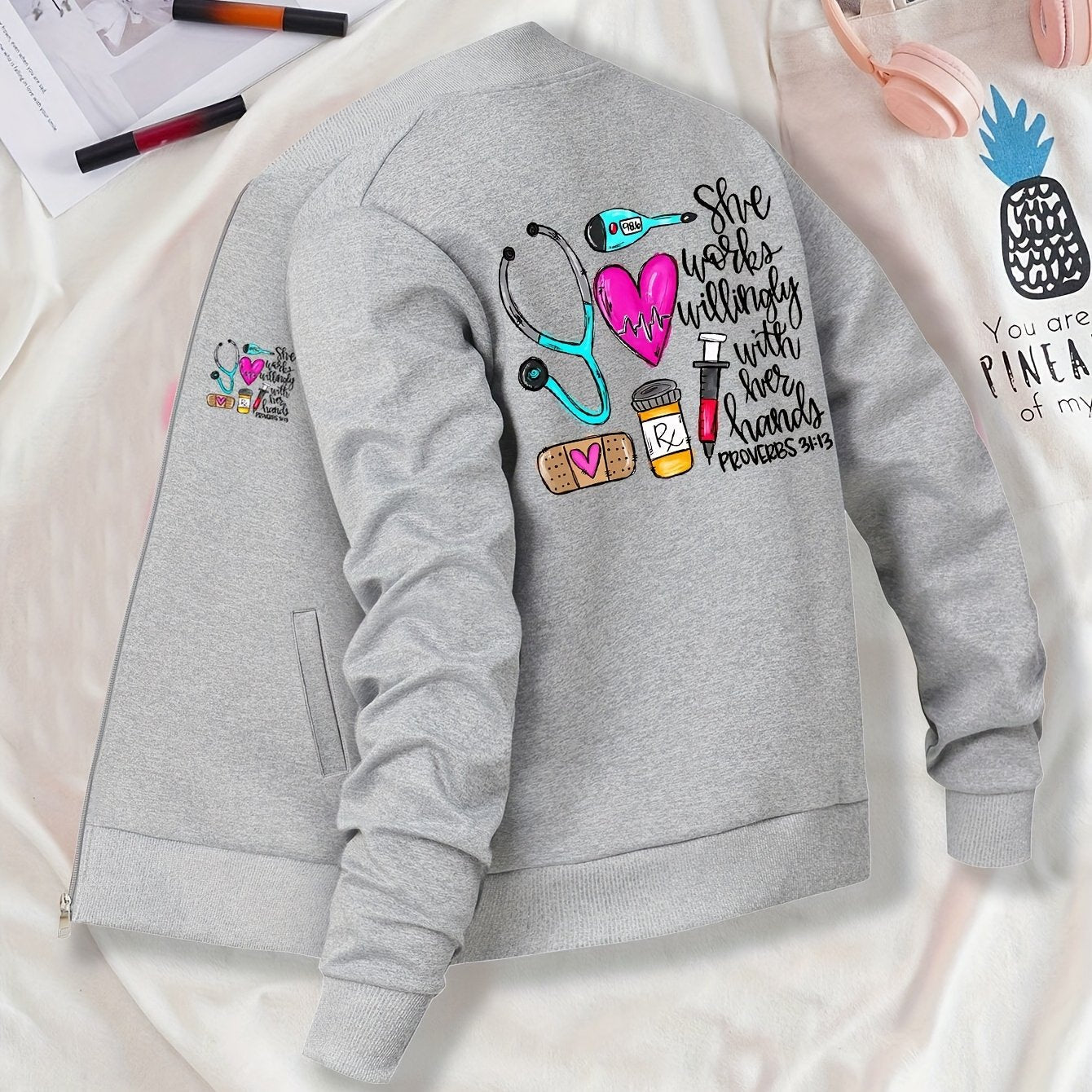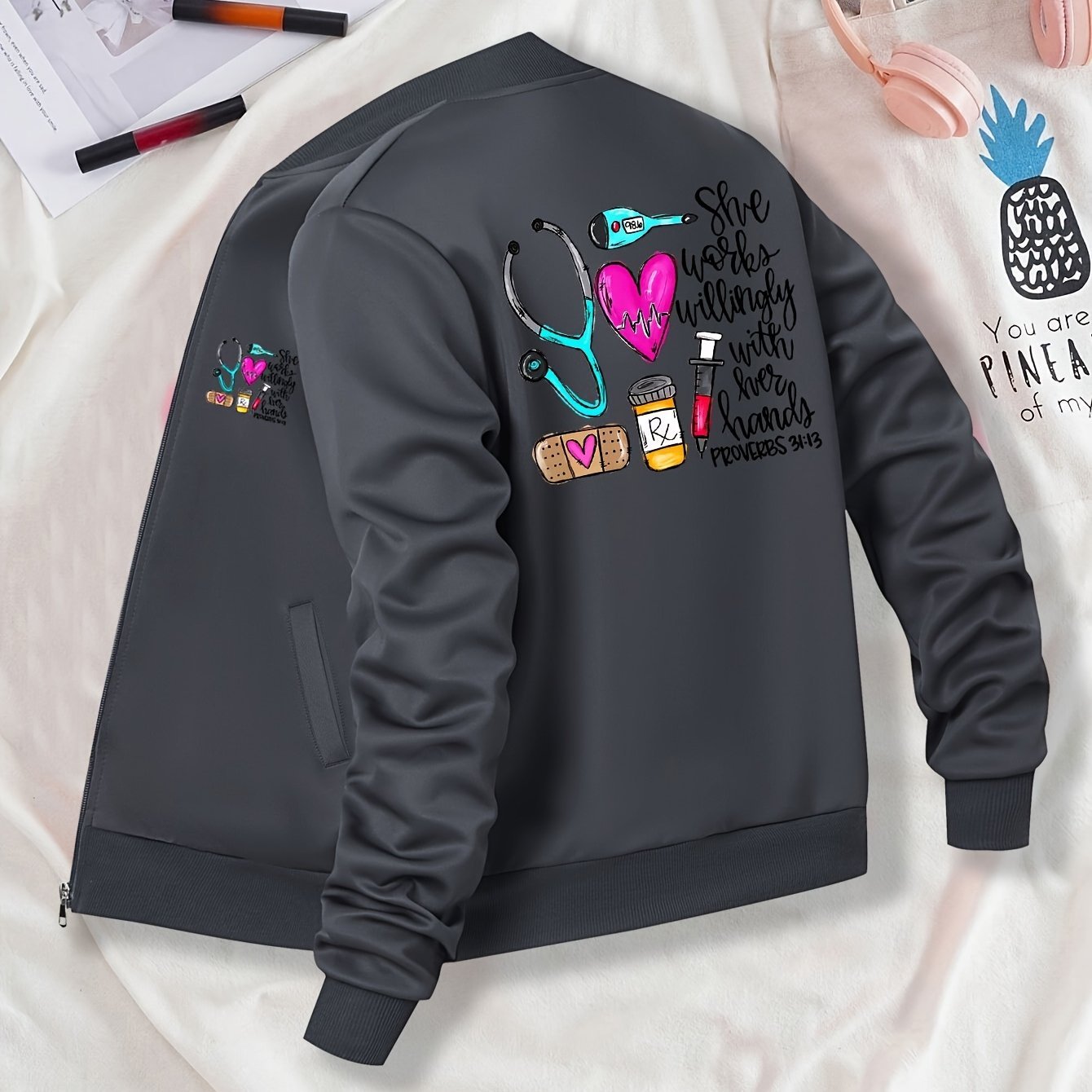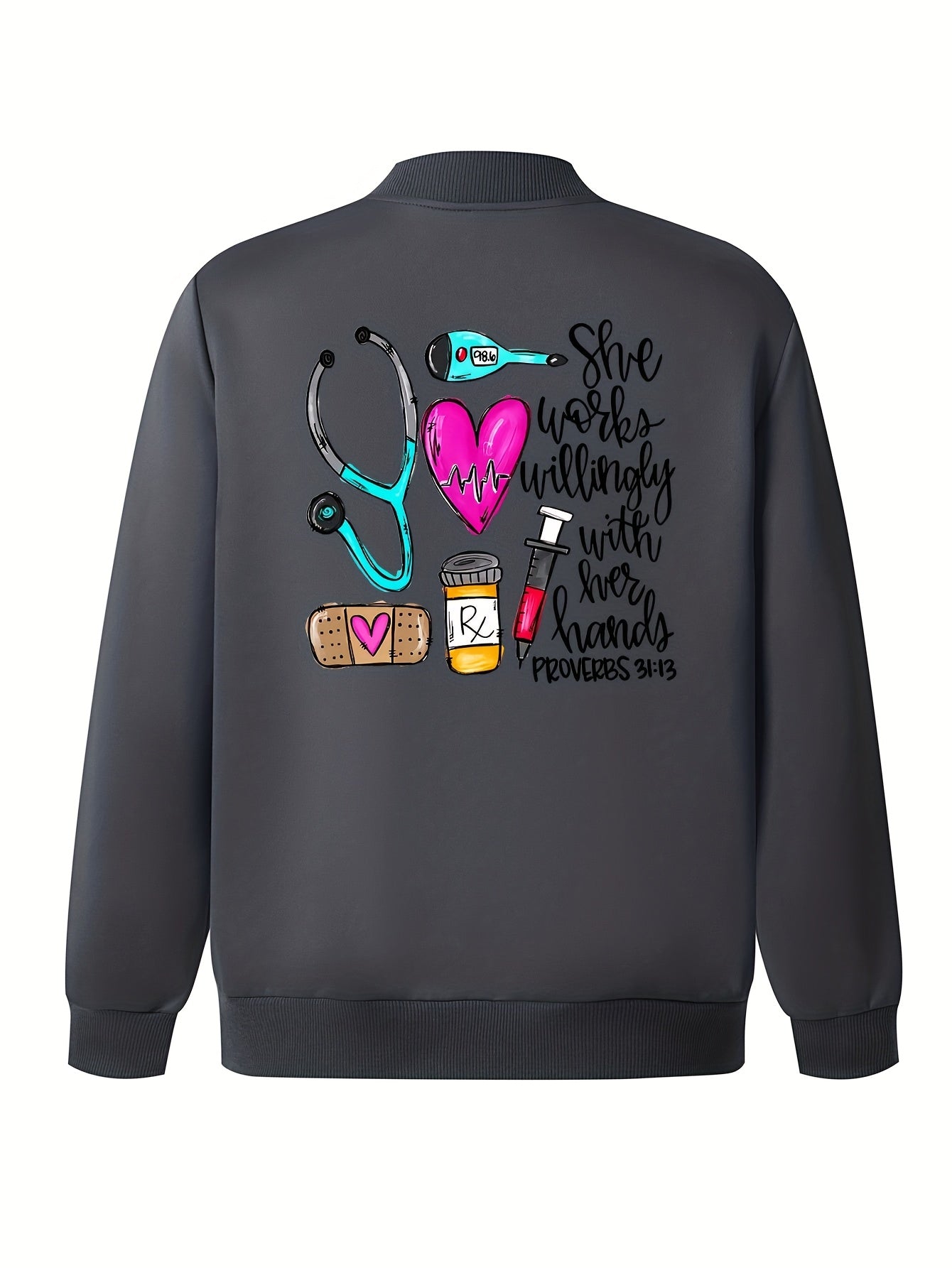 Women's Casual Printed Jacket with Zipper - Stand Collar, Long Sleeve, Pockets, Polyester, Health Care Graphics for Spring, Fall, Winter