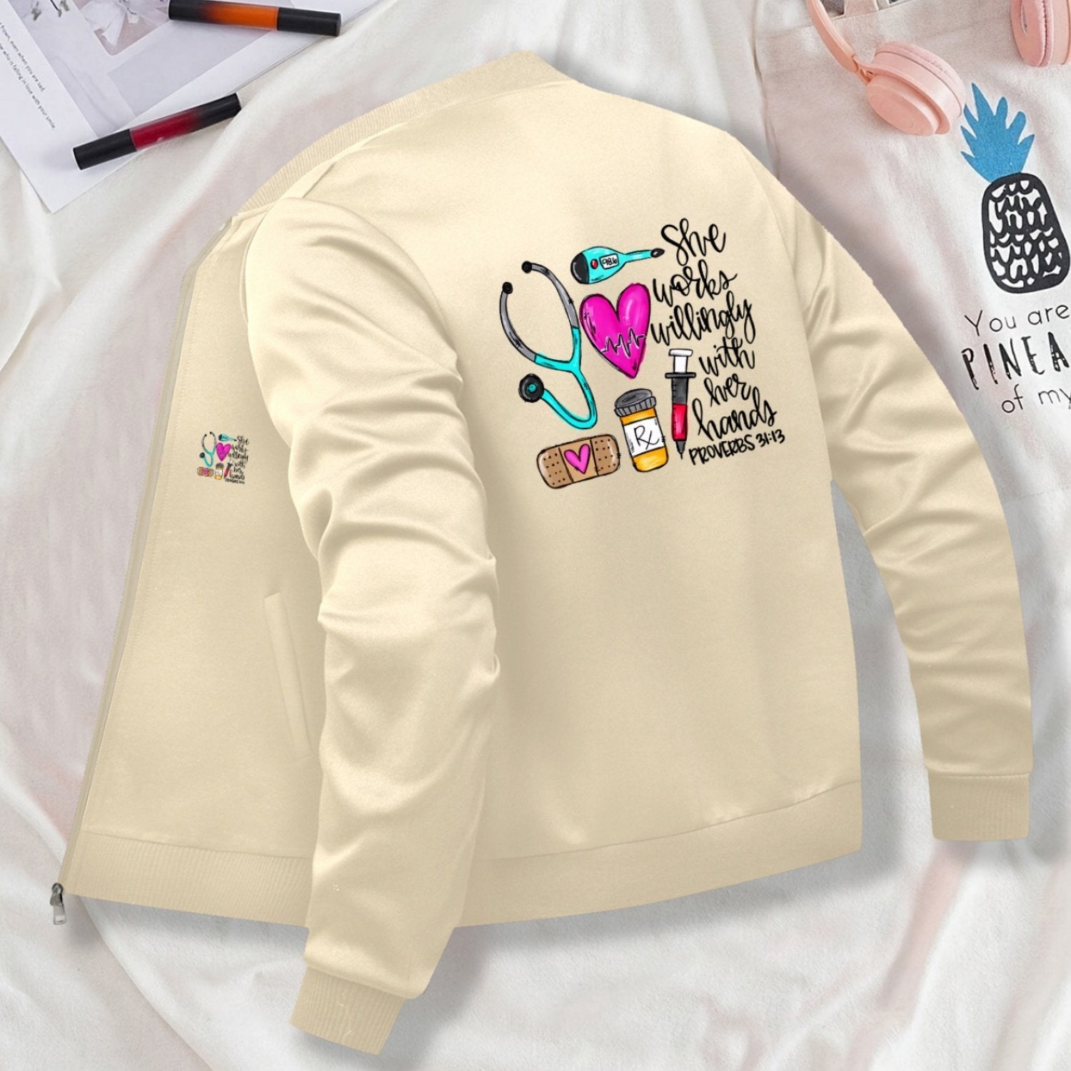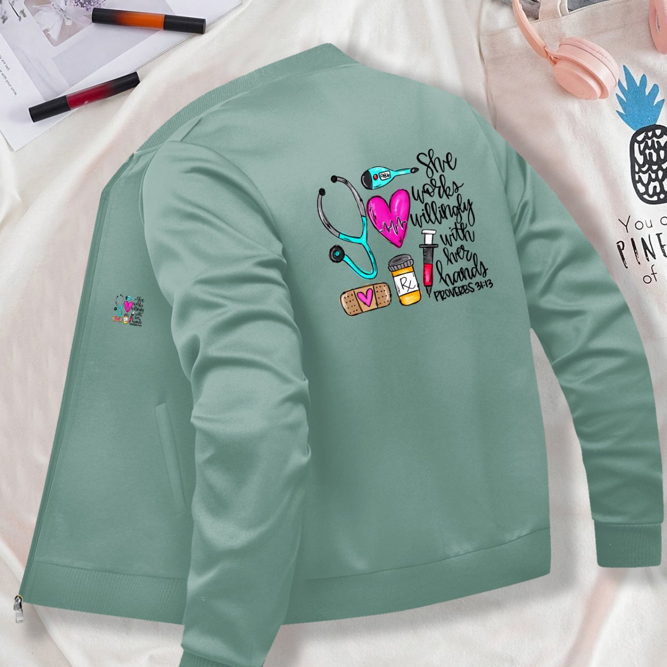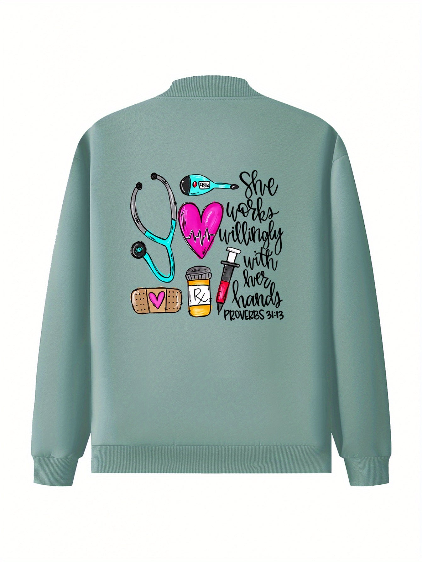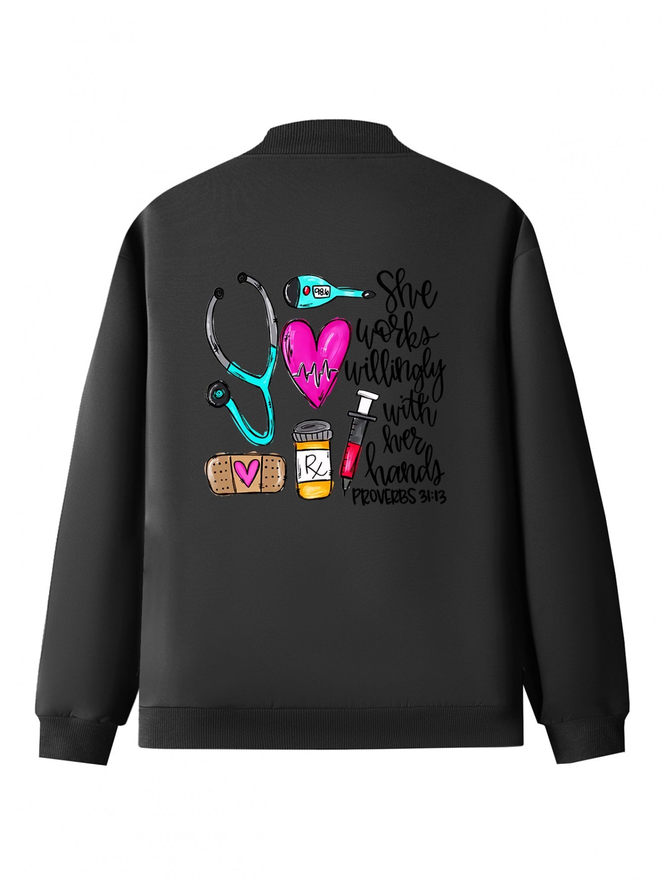 Women's Casual Printed Jacket with Zipper - Stand Collar, Long Sleeve, Pockets, Polyester, Health Care Graphics for Spring, Fall, Winter